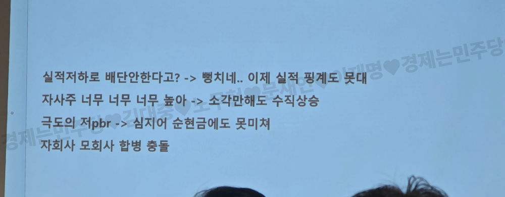 회사가 이익이 났으면 배당금으로 나눠주던가 자사주 소각을 해야 하는데 소각하지 않아서 주식의 총량이 그대로 유지되니 주가는 안 오르게끔 했어요